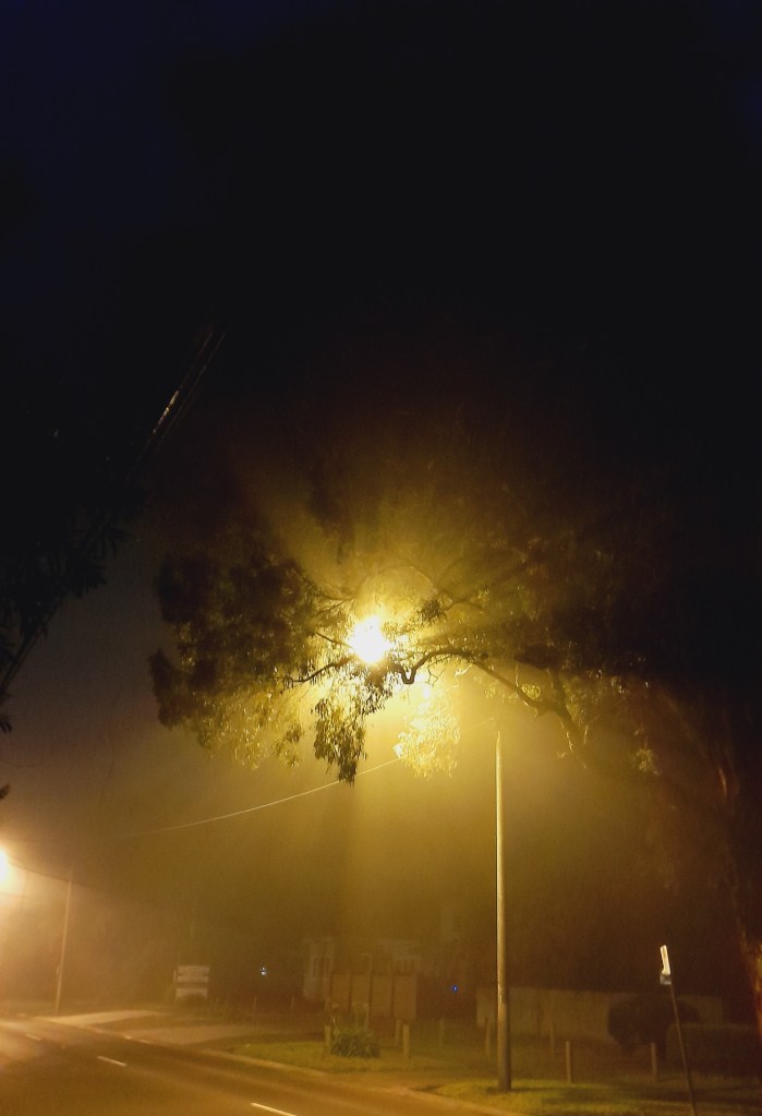 I walked home at midnight the other night after a concert. It was so foggy that all the streetlights left streamers of light through the gumtrees. It was beautiful and calming and I know I’m going to use it in a story or drawing soon.